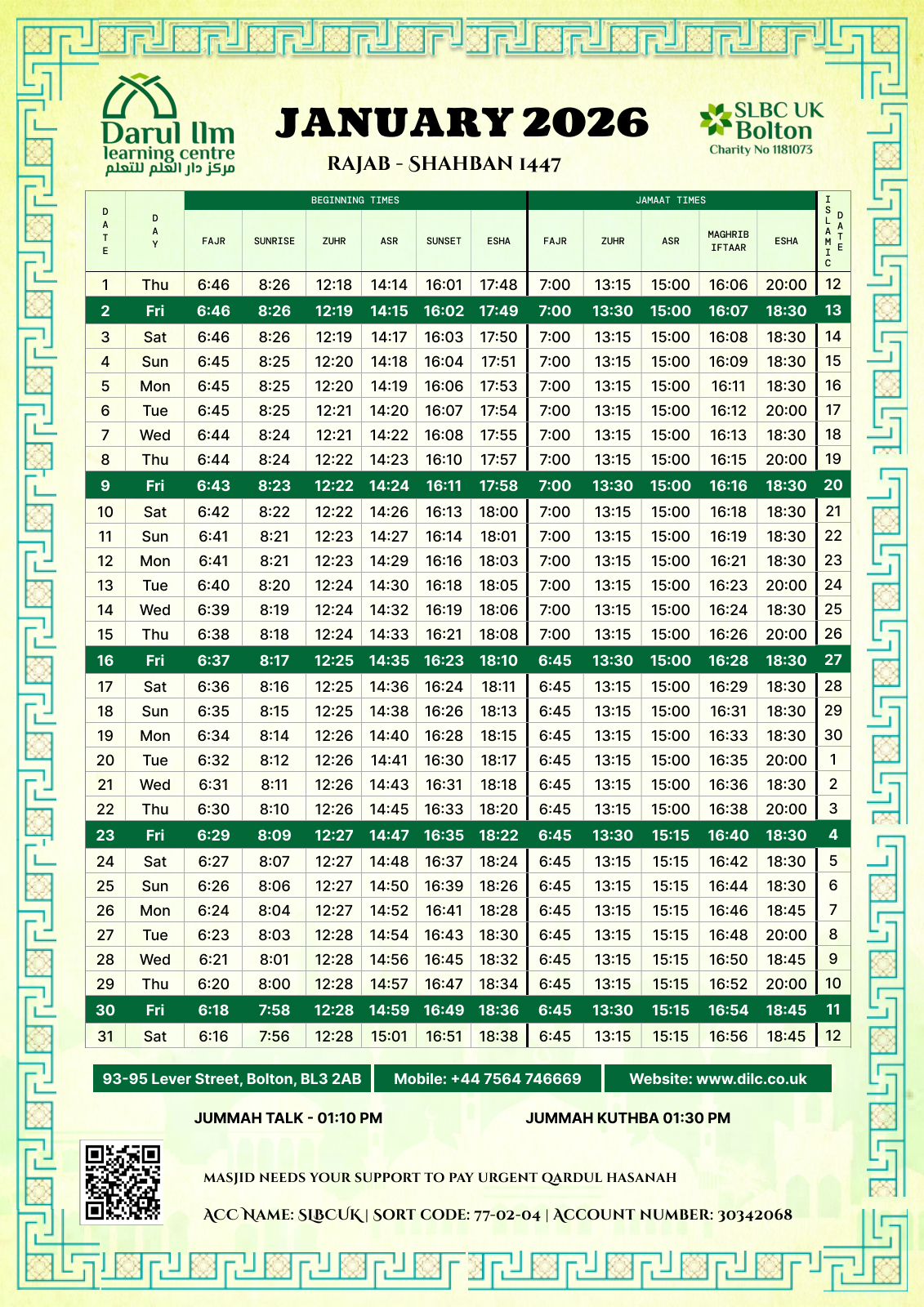 Established in February 2024 by the Sri Lankan Bolton Community (SLBC), Darul Ilm Mosque stands as a symbol of faith, unity, and perseverance. What was once an Irish pub has been beautifully transformed into a house of Allah, a beacon of Islamic devotion and community service for Muslims in Bolton.